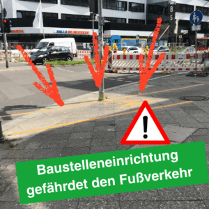 Bereits zum zweiten Mal haben wir uns mit einem Schreiben an die Senatsverwaltung gewendet, um auf die weiterhin bestehende Gefährdung des Fußverkehrs im Bereich der Baustelleneinrichtung am U-Bahnhof Blissestraße aufmerksam zu machen. Trotz unserer wiederholten Hinweise ist bislang keine erkennbare Verbesserung erfolgt – die Situation bleibt unverändert kritisch.