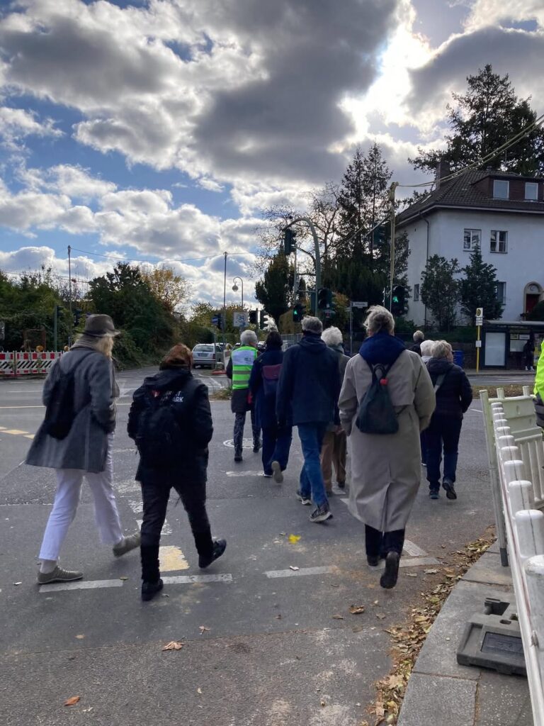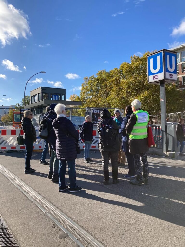 Nach einem kurzen Überblick zu den Bauarbeiten am U-Bahnhof Ullsteinstraße, die auch den Fuß- und Radverkehr auf der Stubenrauchbrücke betreffen, ging es mit Sonnenschein und schönem Herbstlaub den Teltowkanal entlang. Erstaunlich, wie in so kurzer Entfernung zum Ullsteinhaus eine echte Chance auf Ruhe im Grünen besteht. Schade war es allerdings, dass die Schilder zu Beginn der Grünanlagen so oft das Ziel von Graffiti und Aufklebern sind – Wegweiser und Spielregeln werden dadurch unlesbar. Wer also nicht weiß, wo der Grüne Hauptweg entlang führt, wird ihm nicht wirklich folgen können. Da steht noch einiges an Arbeit an.