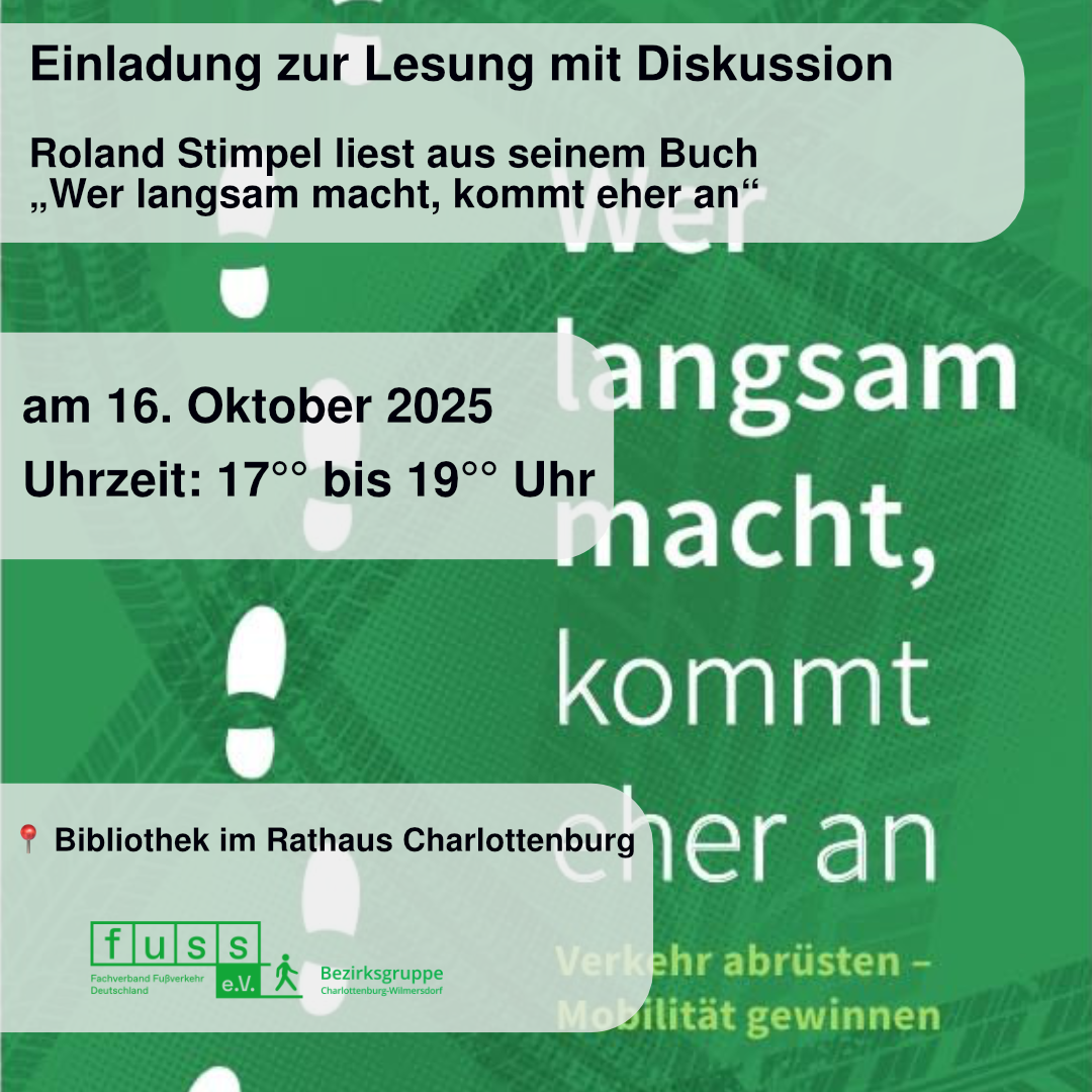 Der Autor und Vorstandsmitglied vom FUSS e. V. Roland Stimpel liest aus seinem Buch „Wer langsam macht, kommt eher an“. Im Anschluss würden wir gemeinsam mit Ihnen über das Gehörte ins Gespräch kommen – insbesondere über das Zufußgehen [...]